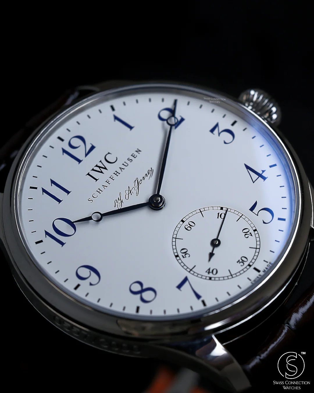 Housed in a refined 43mm stainless steel case, the watch features a beautifully restrained white lacquer dial that evokes the look of classic enamel. It is marked by elegant, elongated Arabic numerals, a railway-style minute track, and traditional leaf-shaped blued hands. The dial carries a nostalgic touch, signed “F.A.Jones” in cursive script at 12 o’clock. The sub-seconds dial at 6 o’clock balances the composition, preserving the clean, symmetrical aesthetic that defined IWC’s earliest wristwatches.