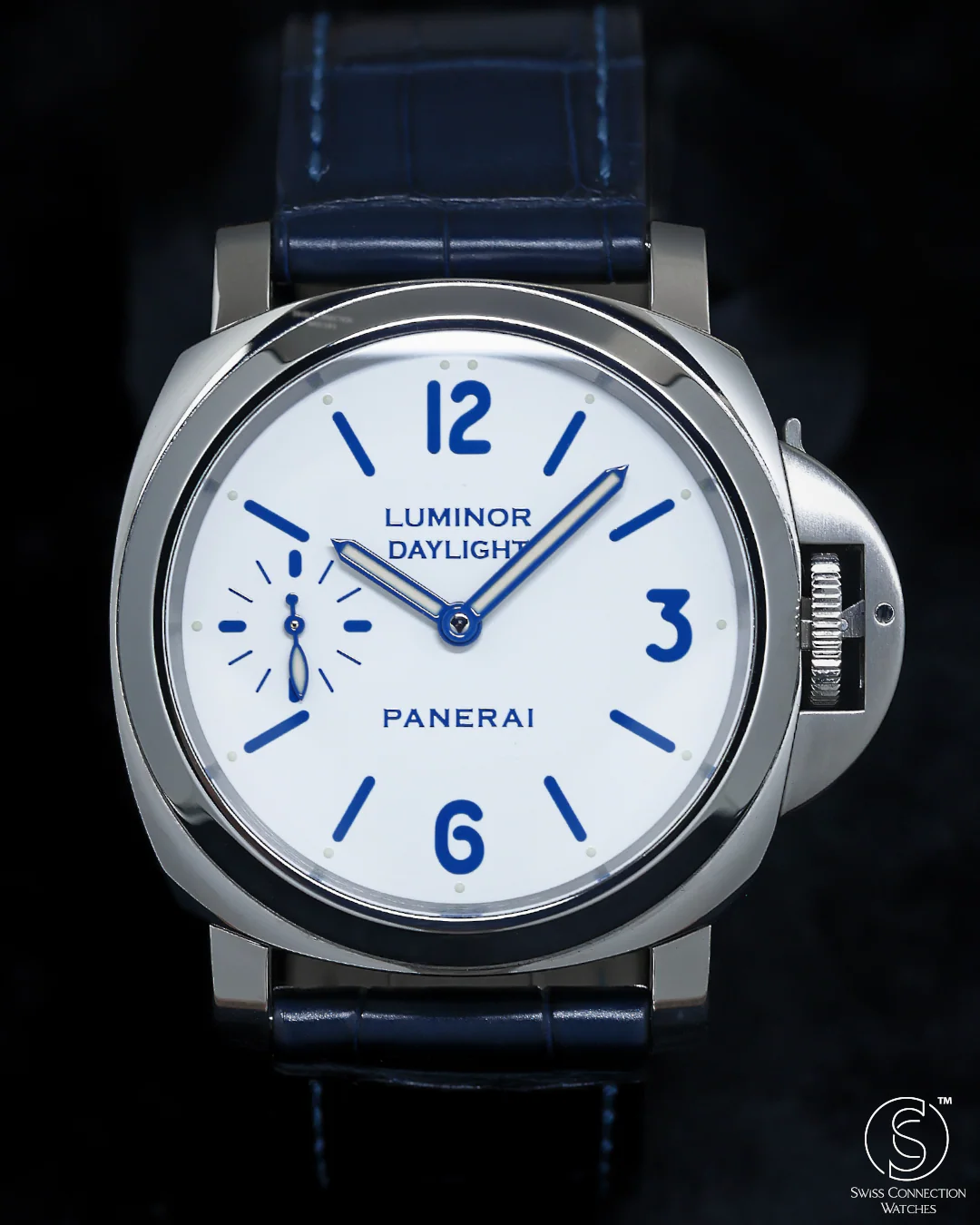 This remarkable set features two watches that share the signature cushion-shaped Luminor case and the unmistakable crown-protecting bridge, a hallmark of Panerai’s tool-watch DNA. The first timepiece is a Luminor Black Seal, distinguished by its robust, left-handed "Destro" configuration and a stealthy DLC-coated case. This nod to Panerai's historical creations for right-handed divers wearing the watch on their right wrist is a key detail for collectors. The second is the iconic Panerai Daylight, which features a vibrant white dial with a rare and sought-after blue text, a detail made famous by its association with Sylvester Stallone. This pairing offers a fascinating contrast, blending the brand's military stealth with a touch of Hollywood charisma.
