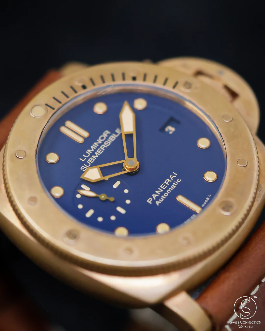 The Panerai Submersible Bronzo reference PAM00671 is a highly sought-after limited edition timepiece, with only 1,000 pieces ever made. Released in 2017, this model features a stunning 47mm bronze case that develops a unique patina over time, giving each watch a personalized, one-of-a-kind appearance. The case is slimmer compared to previous bronze editions, which significantly improves the ergonomics, making it more comfortable to wear despite its large size. This thoughtful redesign enhances the overall wearing experience without compromising Panerai's bold and rugged aesthetic.