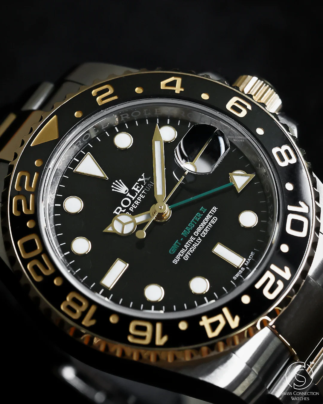 This timepiece is a stunning blend of robust Oystersteel and luxurious 18k yellow gold, which appears on the bezel, crown, and polished center links of the Oyster bracelet. The glossy black Cerachrom bezel provides a refined, modern edge that is perfectly complemented by the classic black dial. Yellow gold accents on the hands and bold maxi hour markers provide a warm contrast, elevating the watch's visual appeal and reinforcing the bi-metal construction. The 24-hour GMT hand, also in gold, allows for tracking a second time zone, making it an ideal companion for travelers.