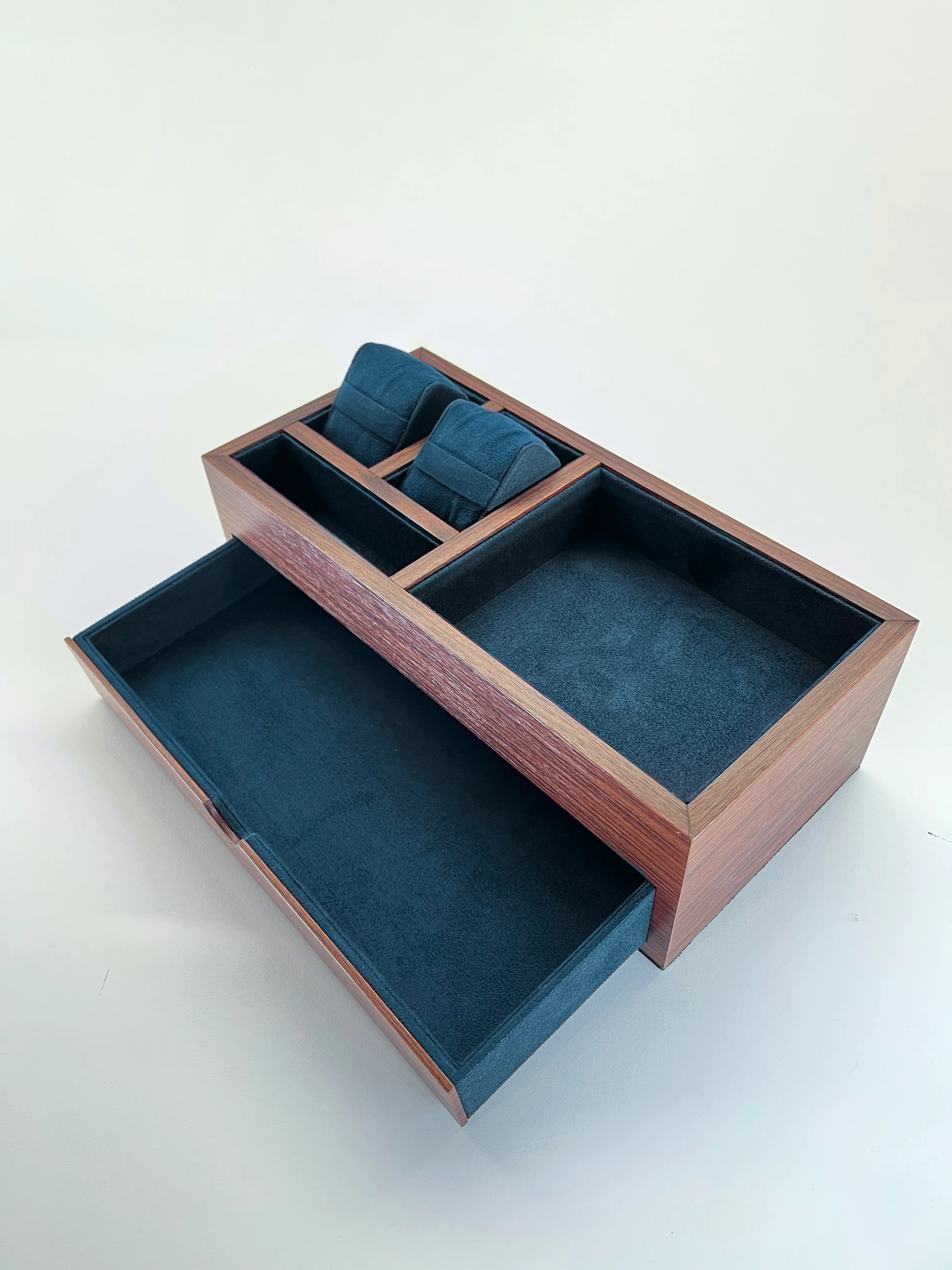 The valet features two individual watch compartments lined in soft dark blue microfibre, each fitted with compressible pillows to accommodate a range of watch sizes. A small drawer beneath adds practical storage for tools or jewellery, while two open compartments keep daily essentials neatly arranged.